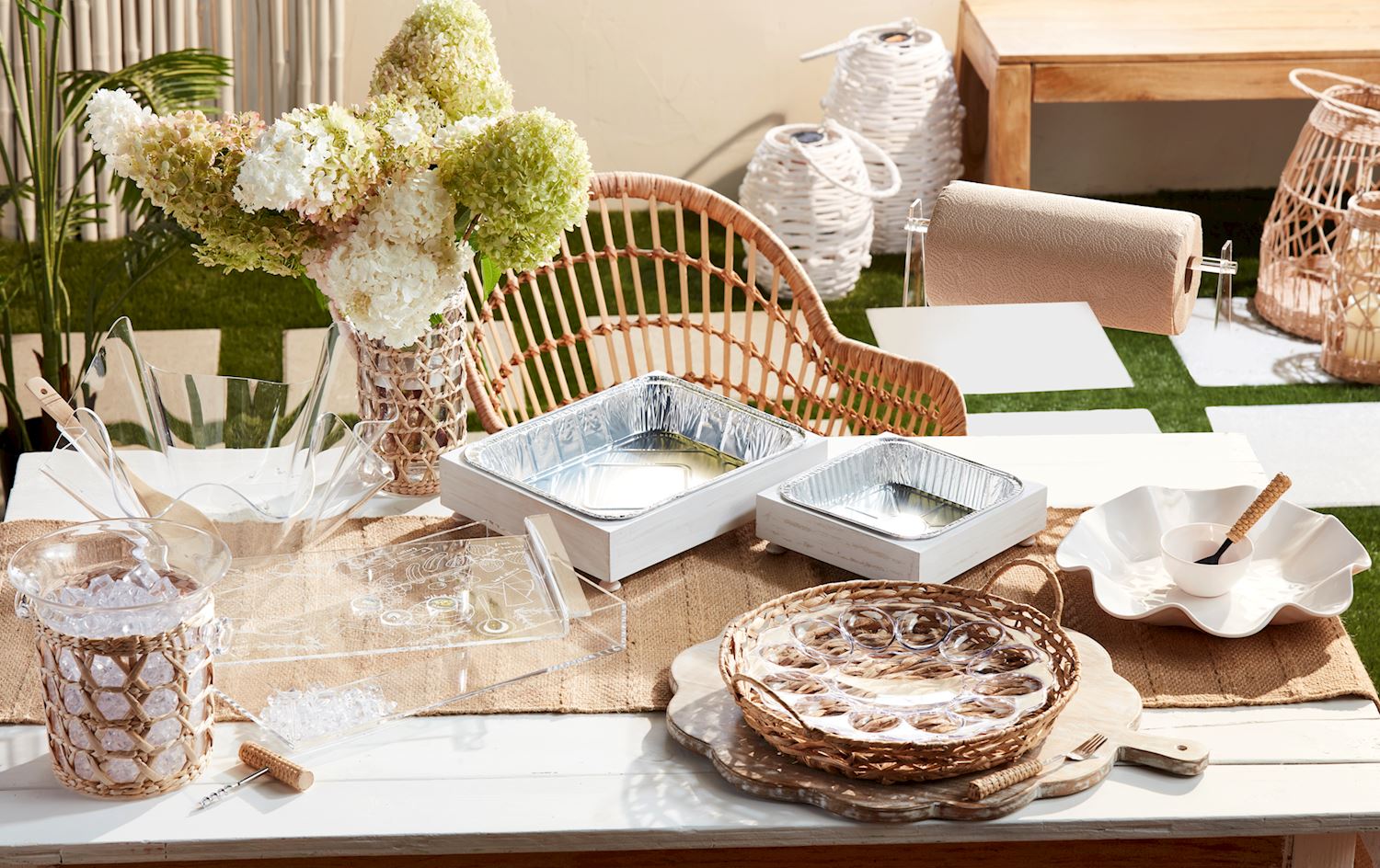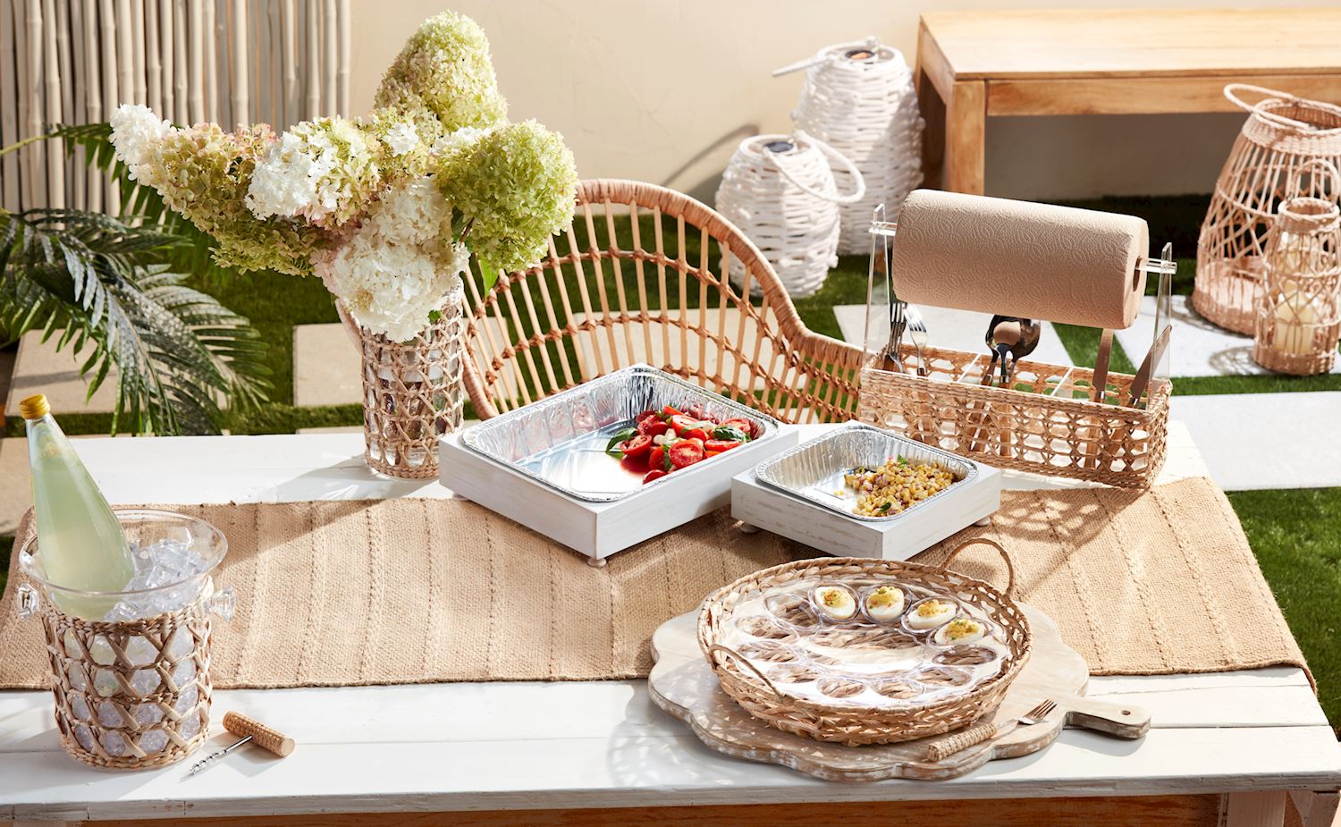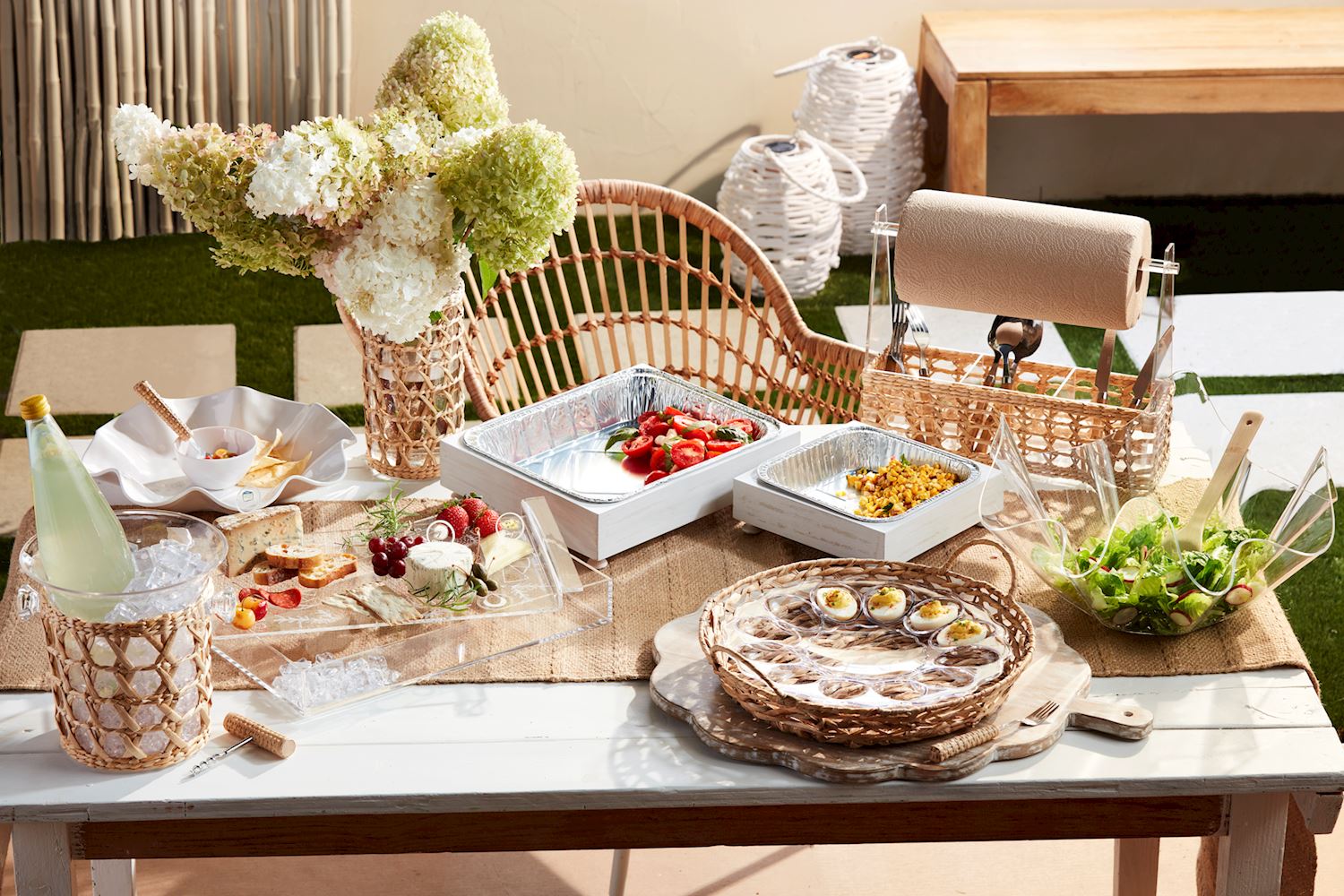 White-washed wood footed serving boxes are sized to hold included 8" x 8" and 9 1/4" x 11 3/4" disposable aluminum pans.