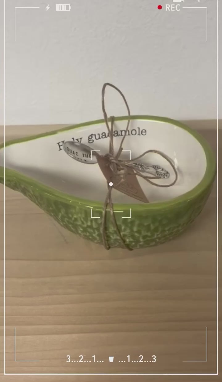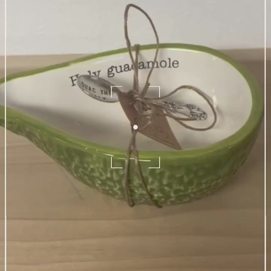 Holy guacamole, we love this Avocado Dip Bowl Set. The two-piece set comes with a hand-painted ceramic figural dip bowl. The dip bowl features an avocado shape. The interior of the bowl reads "Holy guacamole". The dip bowl comes with a silver-plate spoon that reads "Guac the walk".