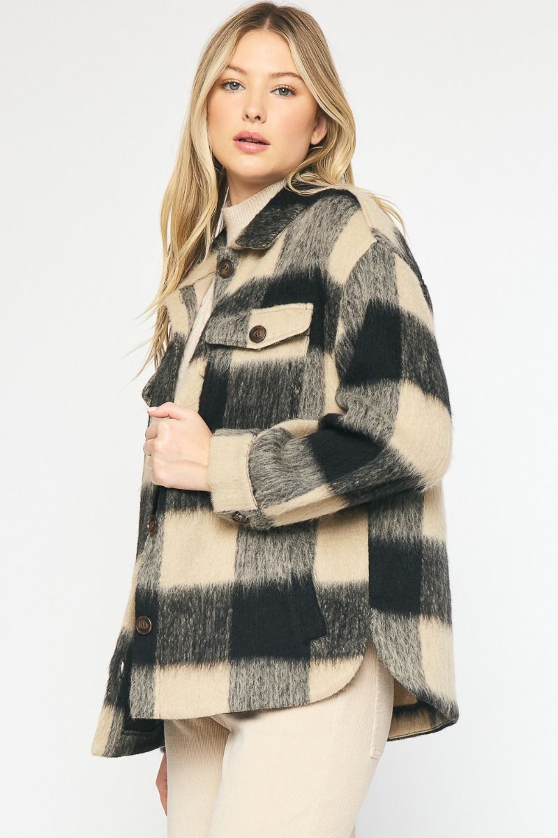 Featuring a bold black and beige check pattern, crafted from a soft, textured wool-blend fabric that feels as good as it looks. Designed with button-flap chest pockets, side pockets, and a slightly relaxed fit, it layers effortlessly over knits or tees for that cool, laid-back look.