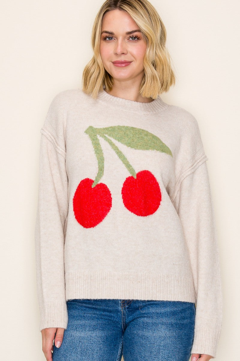 Sweet with a playful twist, this Cherry Printed Sweater is the perfect way to add personality to your everyday wardrobe. Featuring an allover cherry pattern, this super soft knit delivers cozy comfort with an effortlessly cute feel. Designed with long sleeves and a classic crew neckline, it offers a relaxed fit that’s easy to style with denim, skirts, or layered over dresses.