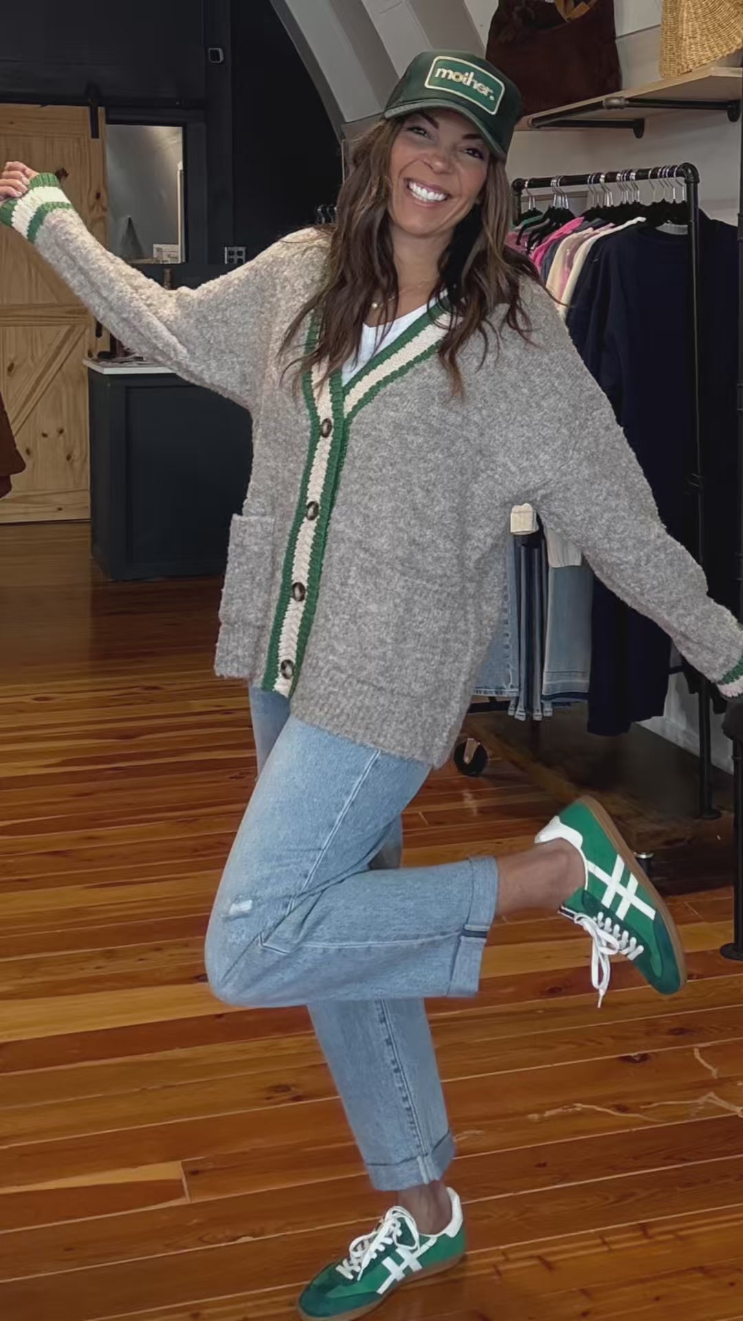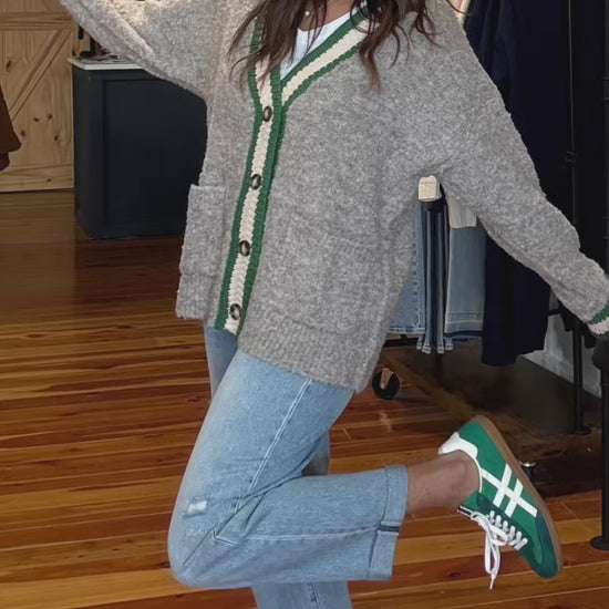 This soft heather gray cardigan features sporty green and cream varsity stripes along the neckline, cuffs, and hem for a pop of contrast. With front patch pockets and button-up style, it’s the perfect mix of casual comfort and preppy charm.