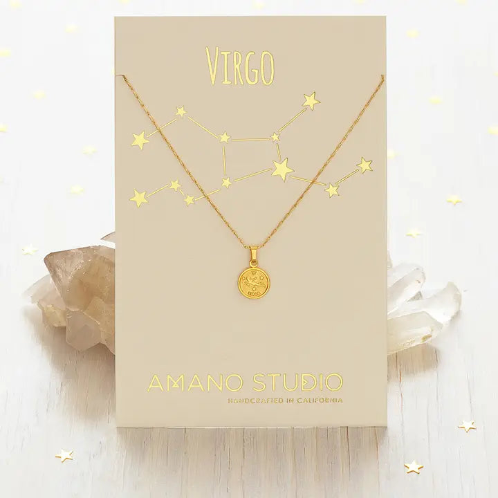 Adorable 1 cm diameter vintage zodiac medallions on 16" + 2" barley chain. 14k gold over brass + ecoat to resist tarnish and create a hypoallergenic surface. Carded on 100% recycled paper, letter pressed gold foil.