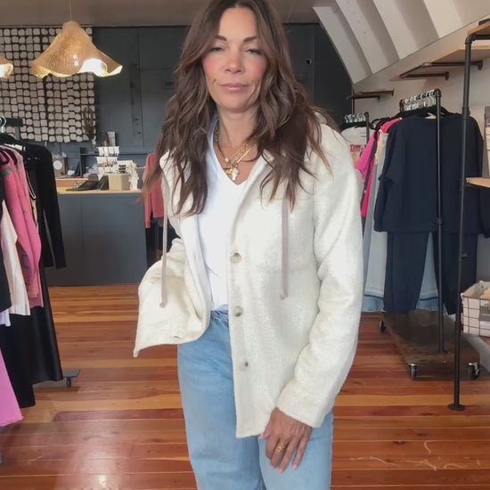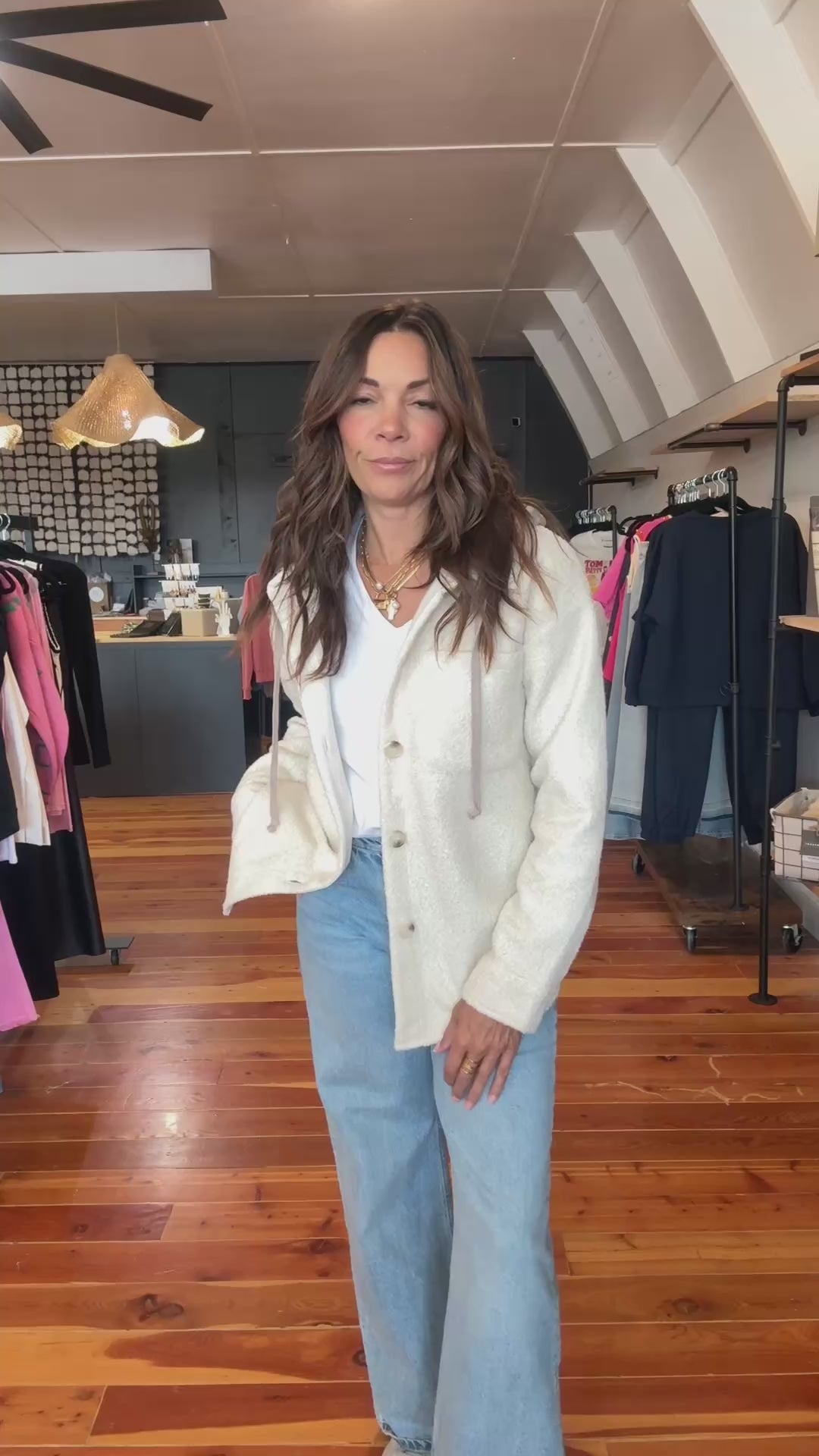 Featuring a button-up front, chest pockets, and a cozy textured finish, this cream-toned shacket comes with a removable hoodie insert for two-in-one versatility. Wear it with the hood for a laid-back layered look, or detach it for a cleaner, classic shirt jacket vibe.