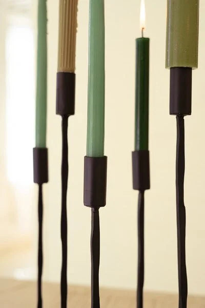 This forged iron metal candelabra holds 11 tapers in your favorite colors. Keep a monochromatic look for wedding centerpieces or go all out for dinner party lighting. This 18" tall candelabra is made in India.