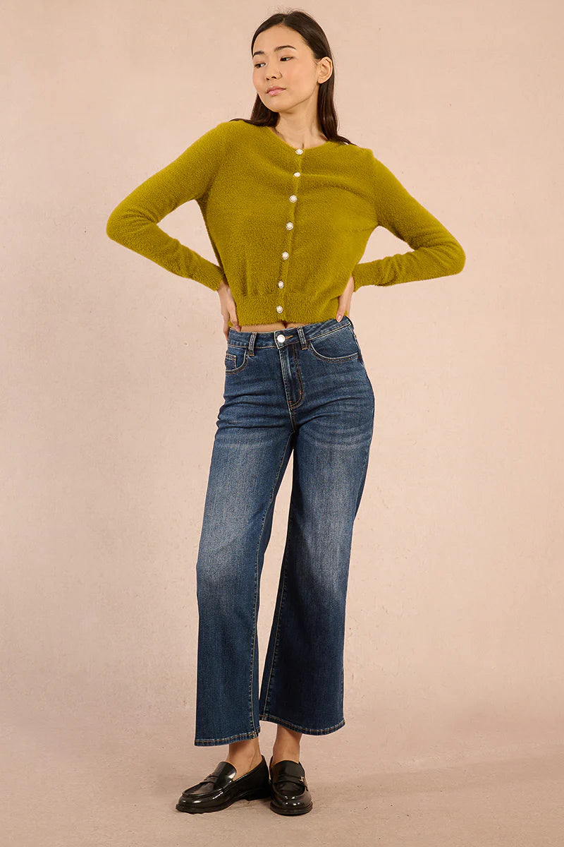This ultra-soft, fuzzy knit cardigan offers both warmth and style with a classic crew neckline and a row of elegant pearl-like buttons framed with delicate metallic accents, adding a touch of vintage glamour. Perfect for layering over jeans or skirts, this cardigan brings a bold yet feminine flair to any outfit.