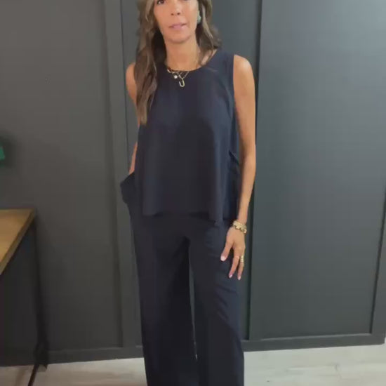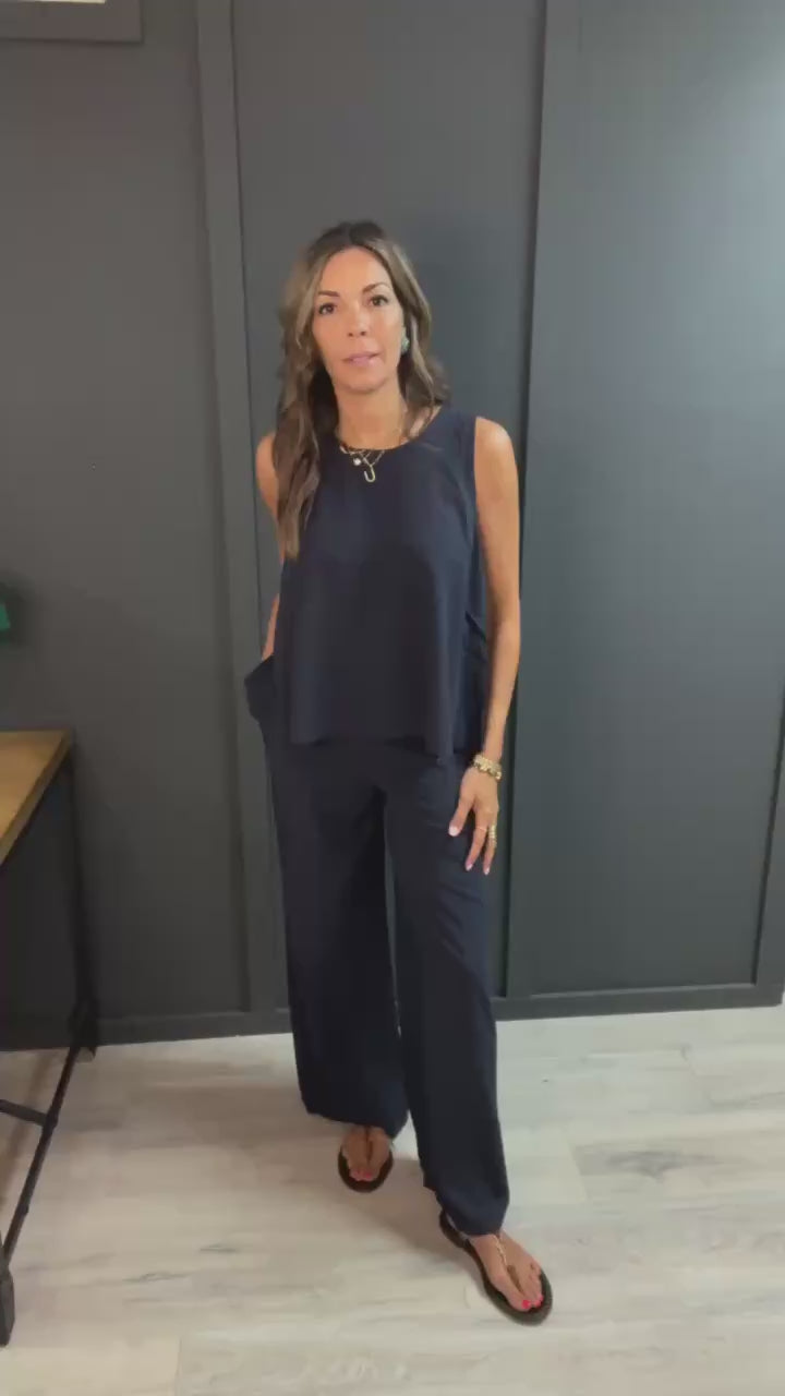 A breezy sleeveless top featuring wide straps, a classic round neckline, and a flared, short cut for a stylish and flowy silhouette. Perfect for a chic, effortless look! Navy in color and goes with anything!