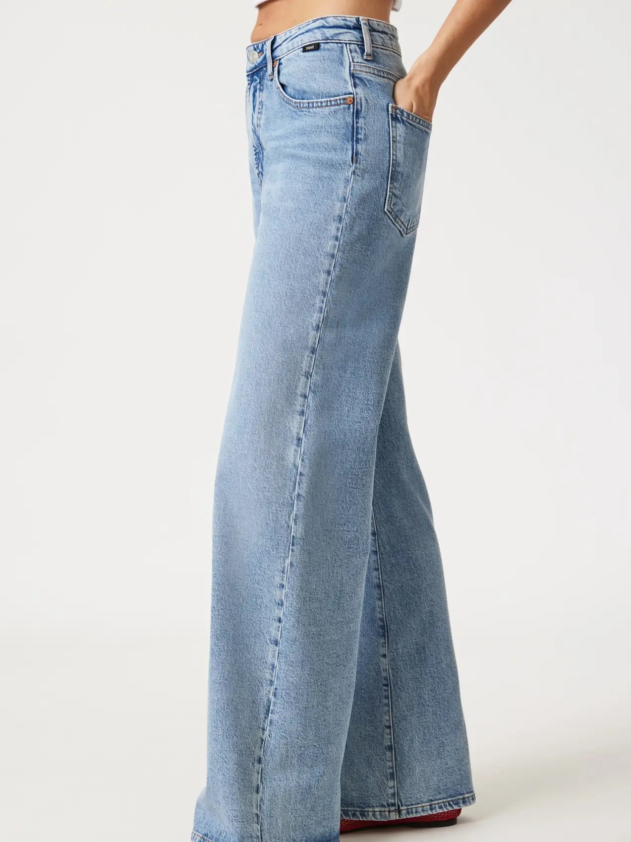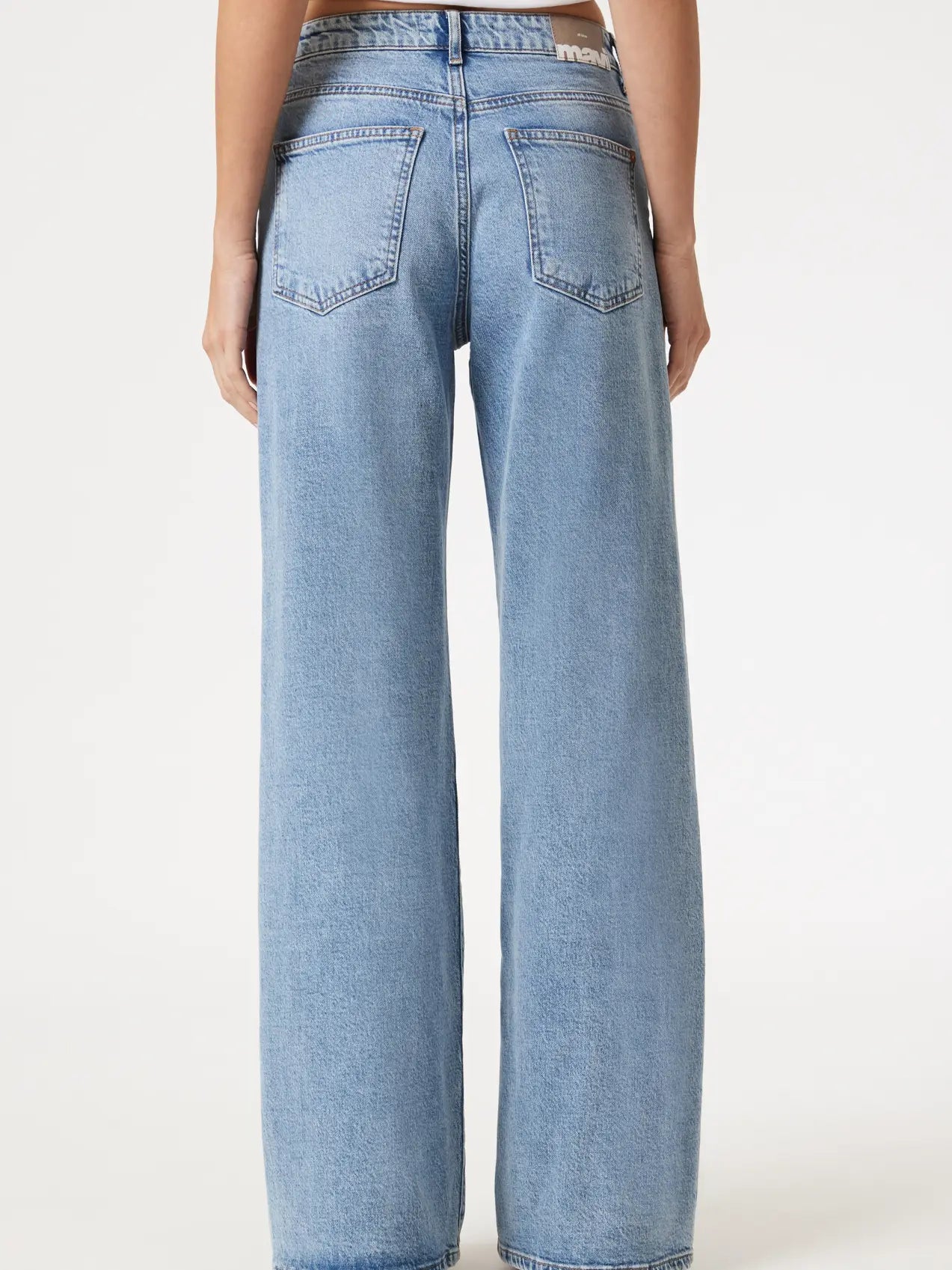 Our newest wide-leg jeans have a comfortable mid-rise waist and fit slim through the hip. Loose-fitting through the leg, they gradually widen to the hem. This fit plays well with any footwear. 11" front rise 14.5" back rise 21.5" knee 23" bottom