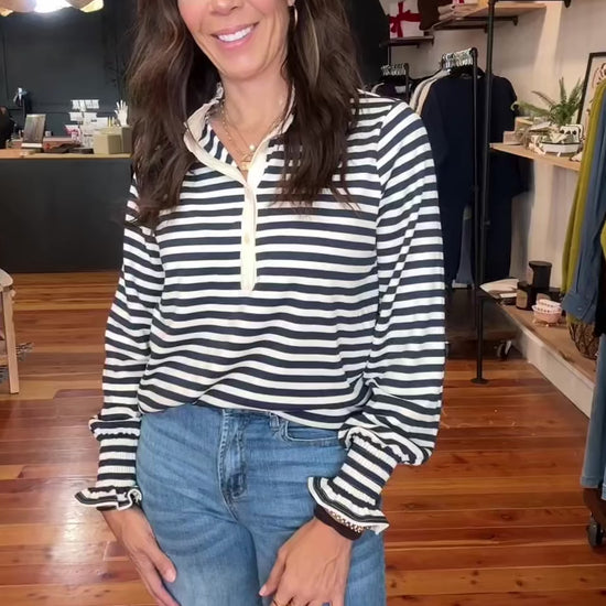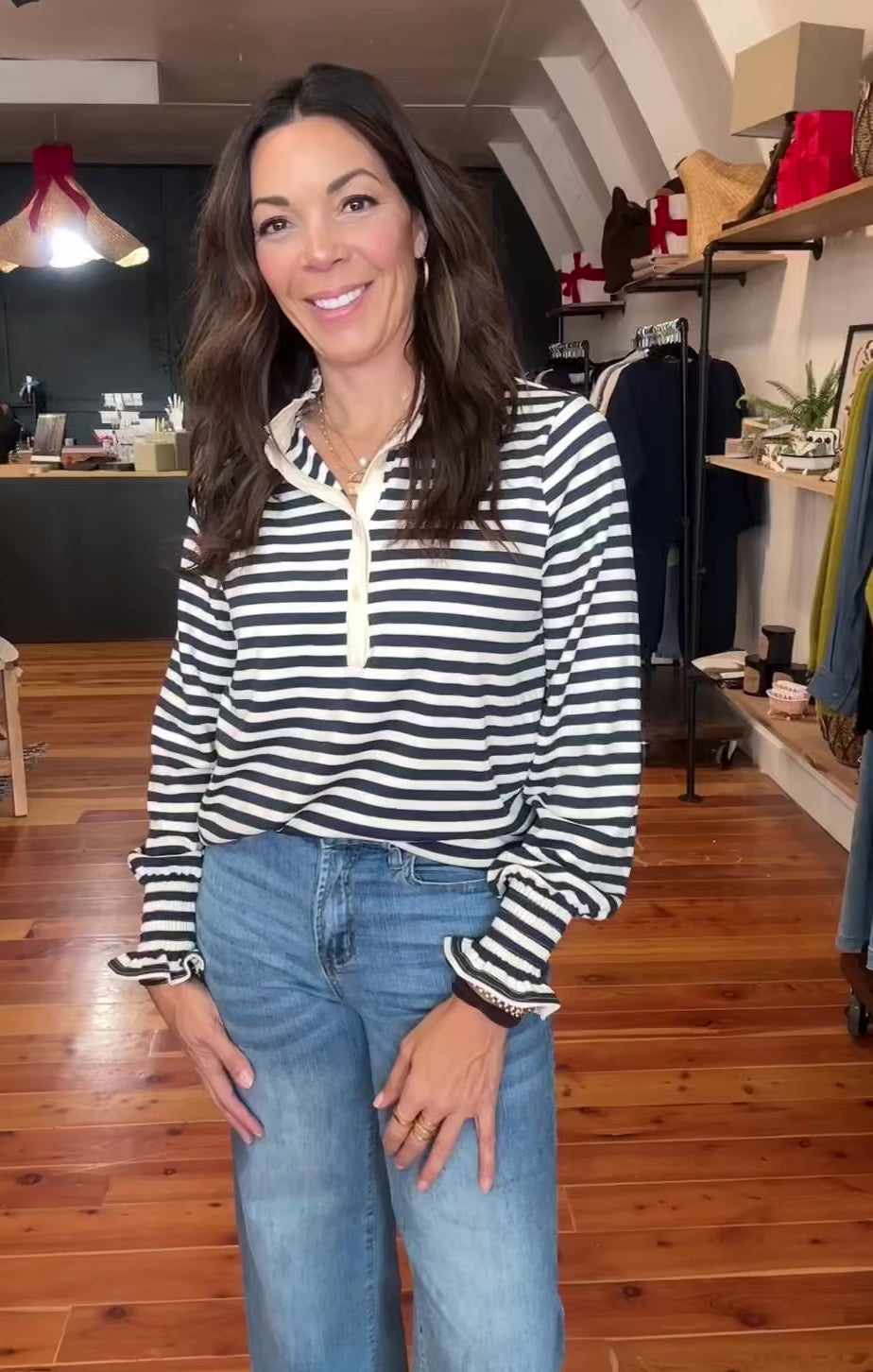Classic stripes meet feminine charm in our Ruffle Collar Half Button Striped Top. Designed to elevate your everyday wardrobe, this versatile piece blends timeless tailoring with delicate details that make it feel effortlessly special.