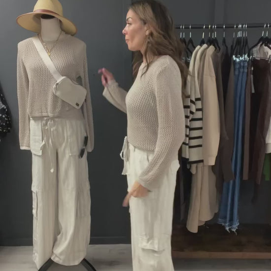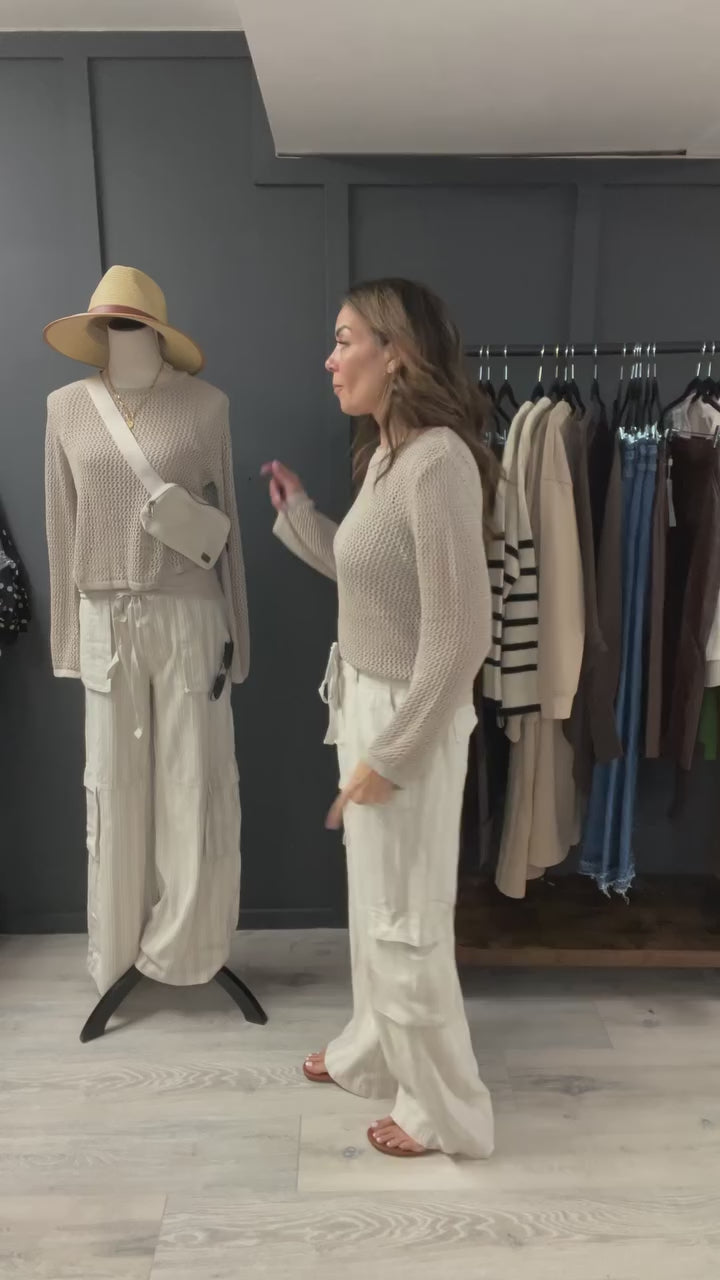 Striped straight-leg pants featuring a linen lurex fabrication, two side hip pockets, two cargo pockets, belt loops, button and zipper closure with a drawstring waist. Two back pockets and an elastic waistband in the back for added comfort.