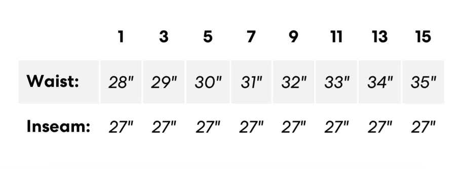 • Front rise: 10.5"• Back rise: 13"• Inseam: 27"