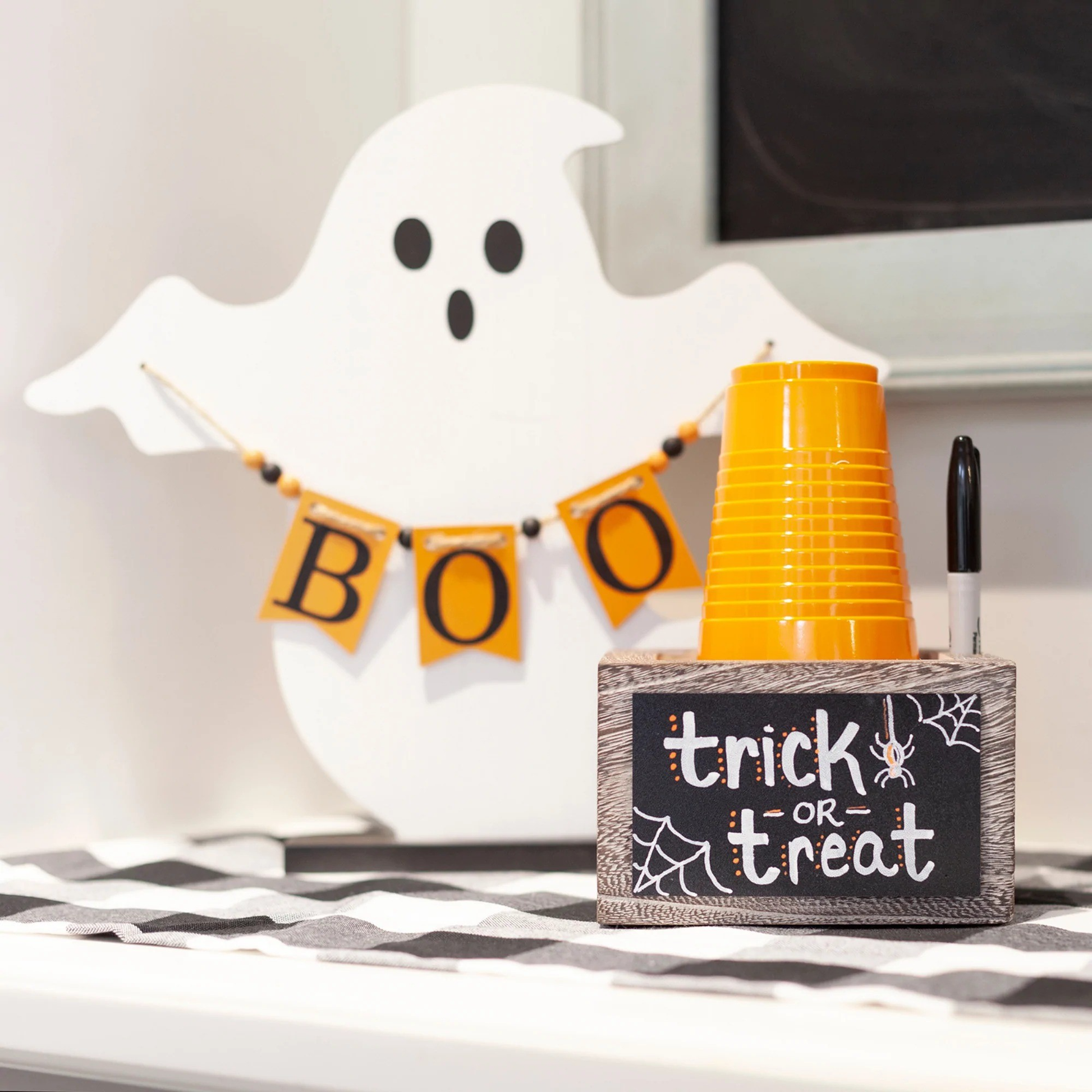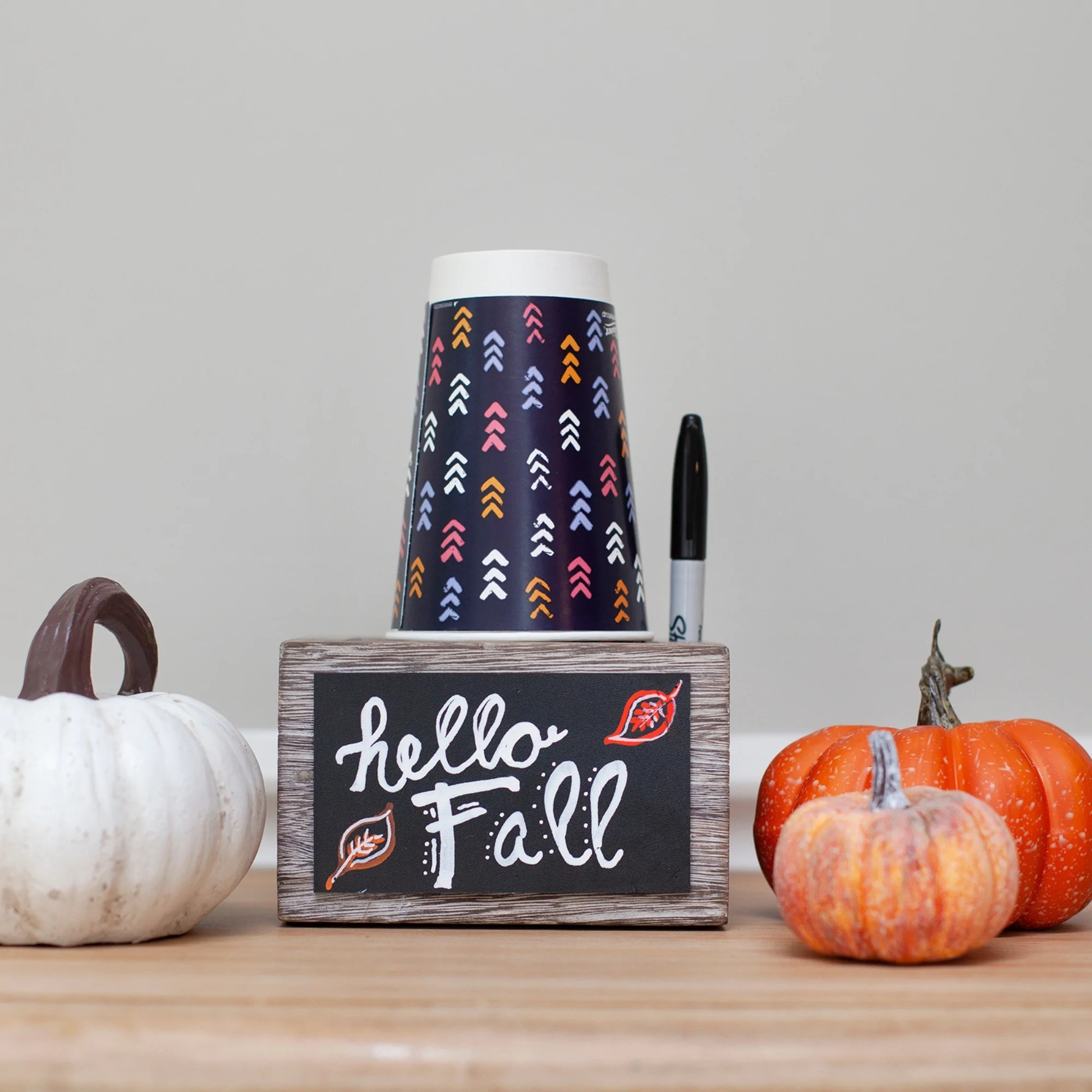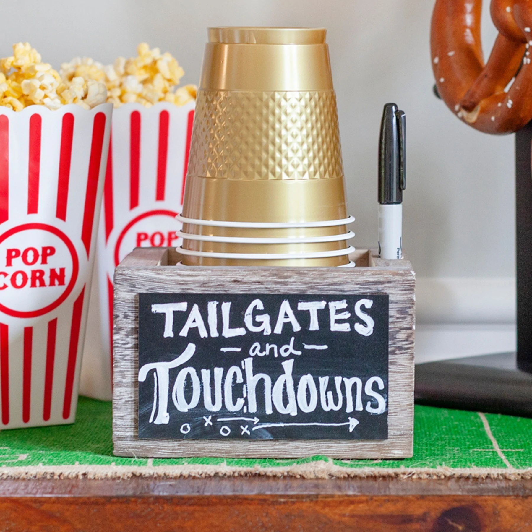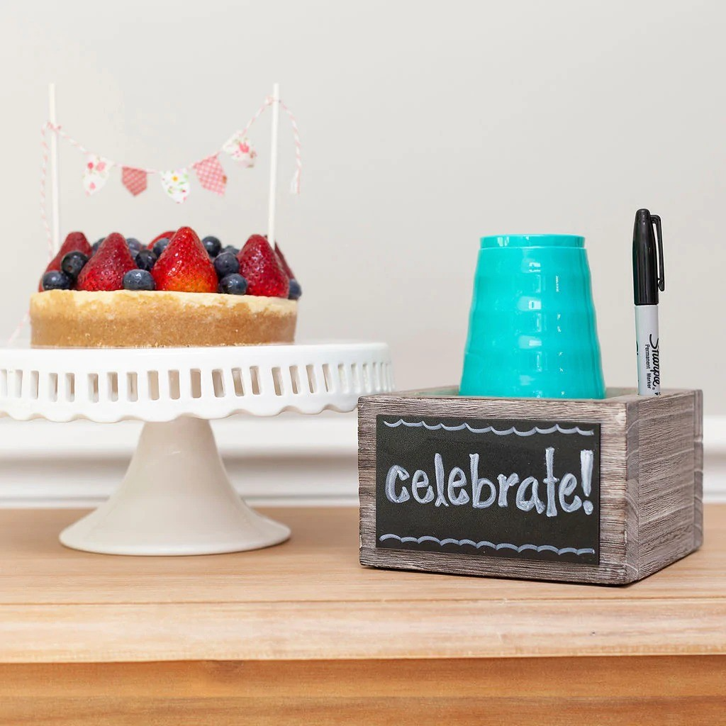 Tired of finding half-empty cups all around at your parties? Grab one of these cup holders complete with a marker slot! Great for all your get-togethers! The rustic color allows it to pair perfectly with any décor! The front is a chalkboard, so you can customize it for each party! This even comes with a chalk pen so you can use it as soon as it arrives!