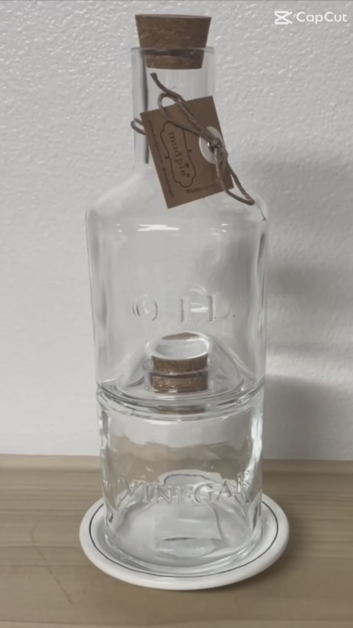 3-piece set. Stacking embossed glass oil and vinegar decanters with cork stoppers. Bottles rest on a ceramic dipping dish.