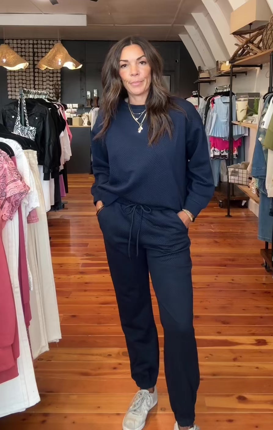 Cozy meets chic in this textured lounge jogger set, designed for effortless comfort and everyday style. Made from a soft, breathable blend of polyester, rayon, and spandex, it features a subtle textured finish that adds depth to the classic navy blue. The long sleeve top offers a relaxed fit, while the matching joggers are finished with a comfortable elastic waistband and cuffed ankles for that perfect laid-back look.
