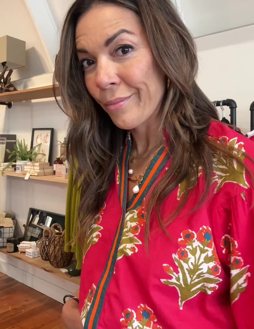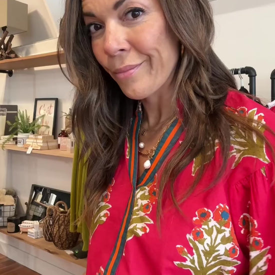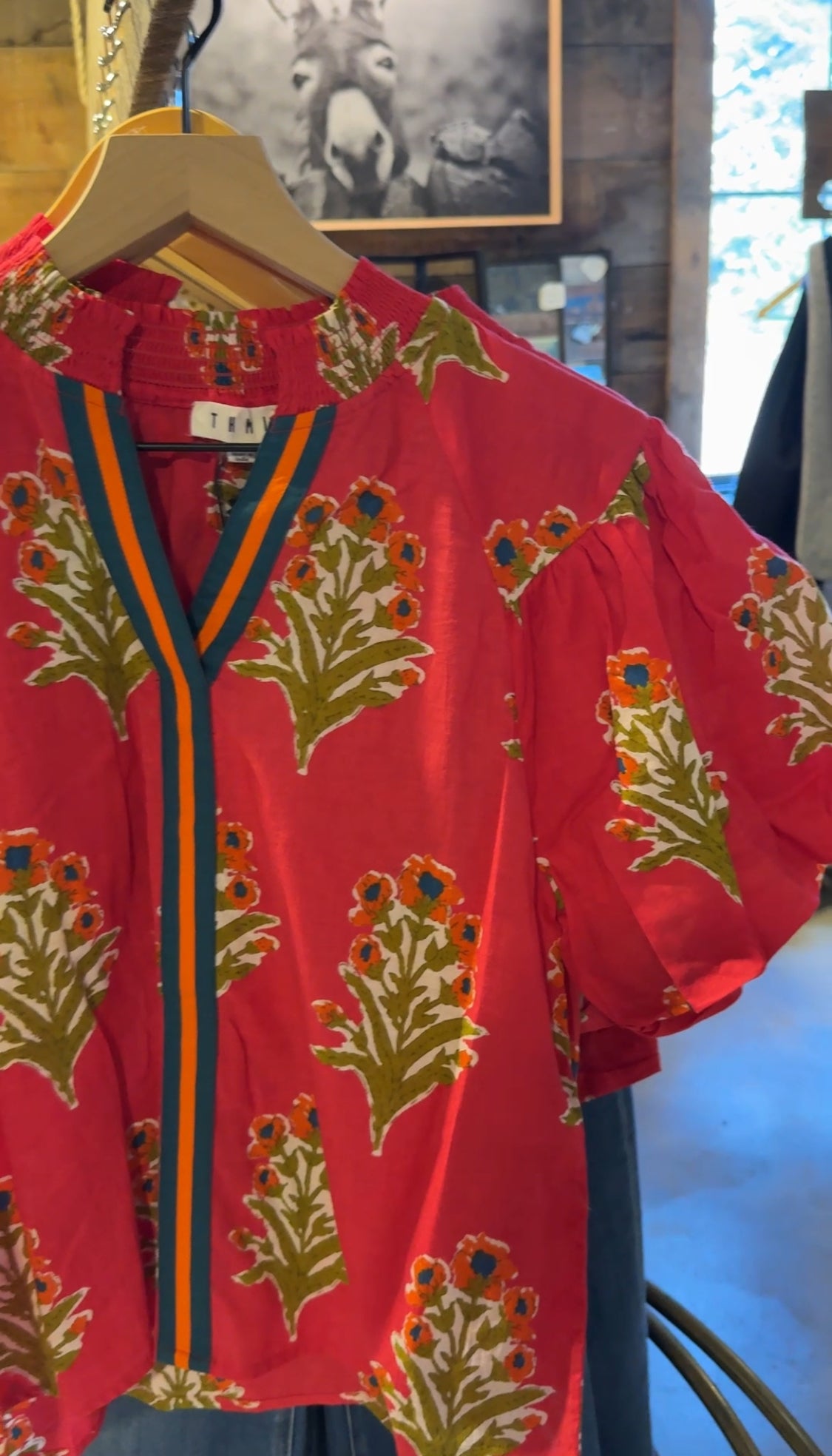 Bright, bold, and full of personality! This vibrant coral-red blouse features an eye-catching floral print, puff sleeves, and a smocked neckline for a flattering touch. The striped trim detail down the front adds a fun pop of contrast—perfect for pairing with jeans or skirts for a playful, polished look. 🌸✨