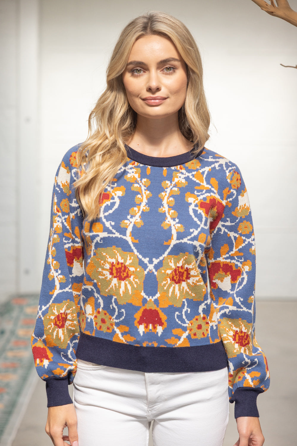 This sweater is different and so fun! Features a pattern in rich shades of blues, creams, marron and mustard. Designed with puff sleeves and ribbed trim, it offers both comfort and bold style, making it perfect for fall and winter layering. A standout piece that pairs beautifully with denim or tailored bottoms for a chic seasonal look.